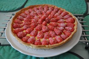 Garnissez-la alors de la crème pâtissière, puis disposez les fraises coupées en deux (voir la photo) et saupoudrez de sucre glace.