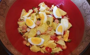 Épluchez les pommes de terre et mettez-les, coupées en deux (ou 4 si elles sont très grosses), dans une casserole d’eau froide salée. Portez à ébullition et laissez cuire entre 10 et 20 minutes (selon la grosseur des pommes de terre) : attention à ne pas trop cuire pour que ça ne fasse pas de la purée dans la salade.