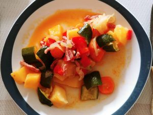 Lorsque l’eau bout, ajoutez les autres légumes (sauf la courgette et la patate douce qui cuisent plus vite, et l’oignon dont on se servira plus tard).