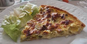 un moule à tarte de 28-30 cm de diamère une pâte brisée 1 oignon 500 g de poireaux coupés en rondelles 4 œufs 2 dl de crème fraîche (un peu de curry si l’on veut) un peu de beurre et d’huile