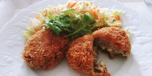 Dressez 2 croquettes par assiette avec une salade de chou, carotte et oignon émincés (légèrement assaisonnée d’huile d’olive, vinaigre de riz et sucre) et décorez avec un peu de cresson, roquette ou mâche.