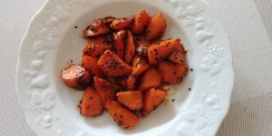 1 patate douce entre 250 et 300 g 2 cuillerées à soupe d’huile de sésame ou de pépins de raisin 1 cuillerée à café de sauce soja 1 cuillerée à café de vinaigre de riz 3 cuillerées à soupe de sucre 1 cuillerée à café de graines de sésame noir