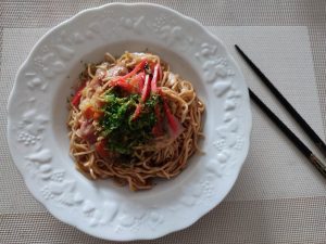 Égouttez, répartissez l’huile de sésame sur les nouilles et mélangez jusqu’à ce que toutes les nouilles en soient enveloppées (afin de les empêcher de se coller).